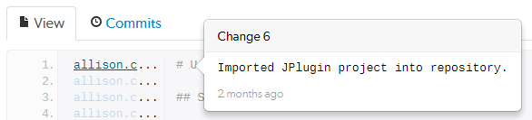 Each userid presented is a link that, when clicked, displays the changelist that provided the associated text. Muted userids indicate that the associated text is from the same changelist as the line above. For example, the userid allison.c is responsible for lines 1, 10, and 12 in the screenshot above.
